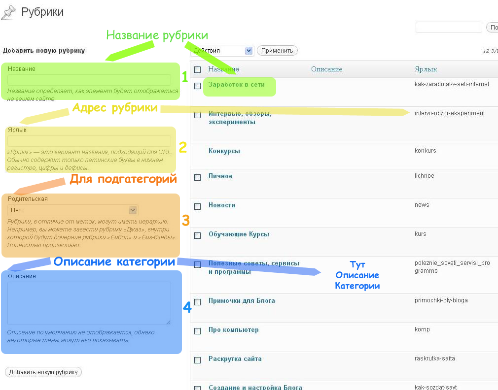 Добавление рубрик в WordPress